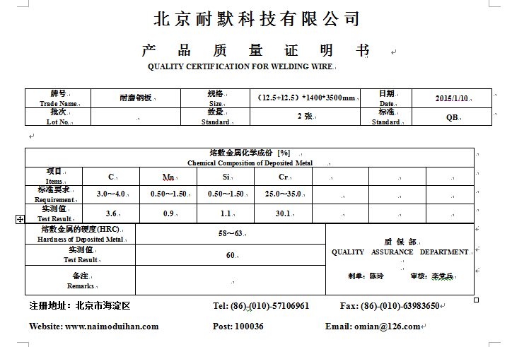 圖(2)北京耐默公司硬質(zhì)合金堆焊焊絲產(chǎn)品質(zhì)量證明書